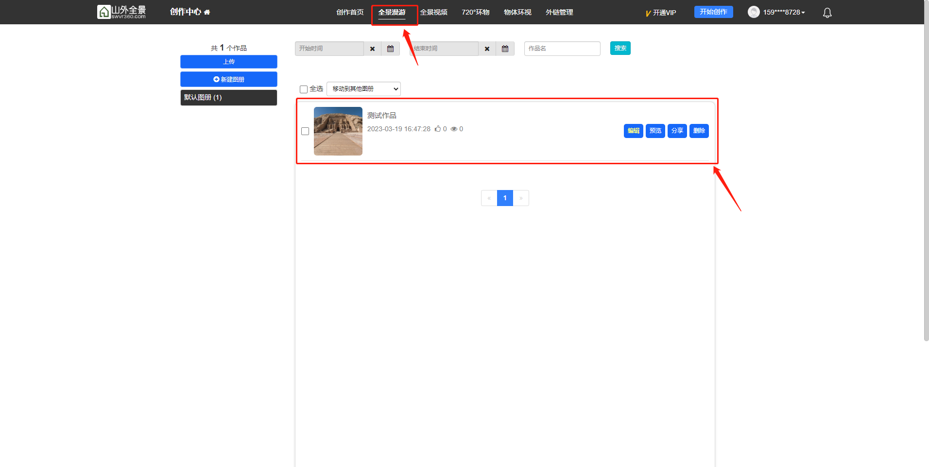 刚发布的全景图片,系统会自动跳转到 全景漫游 作品首页 或 可以 继续发布作品。点击 编辑 即可进入作品功能编辑页面。
