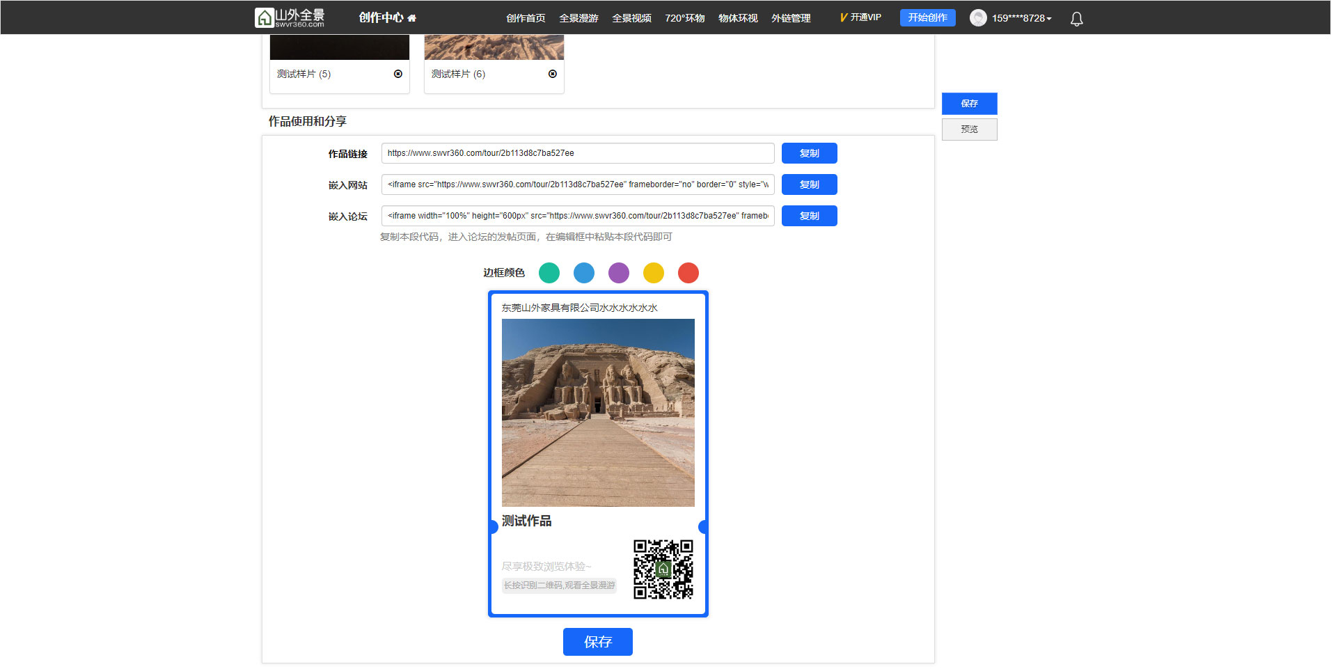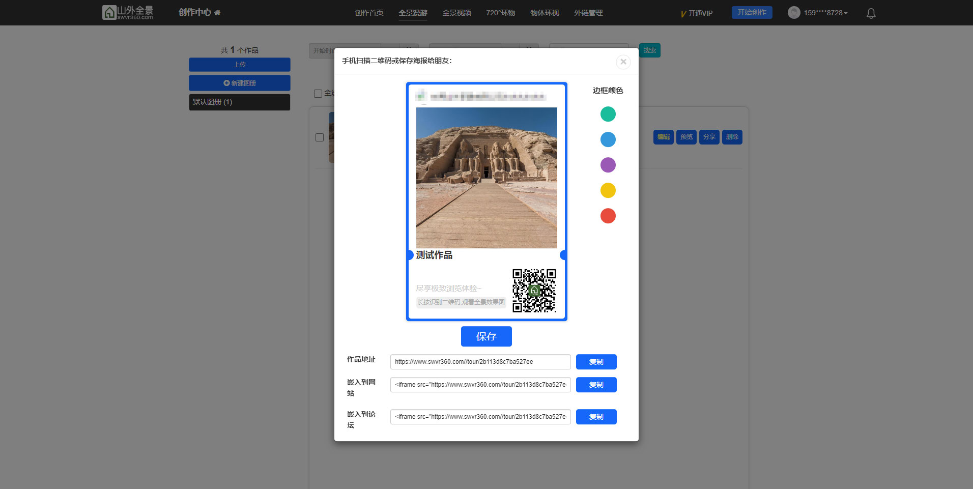 全景作品可以通过 链接 和 海报 的形式分享到微信、qq、朋友圈等社交媒体,也可把链接嵌入到网站、app、小程序中展示。链接和二维码可以在功能编辑页面获取,如下图所示: