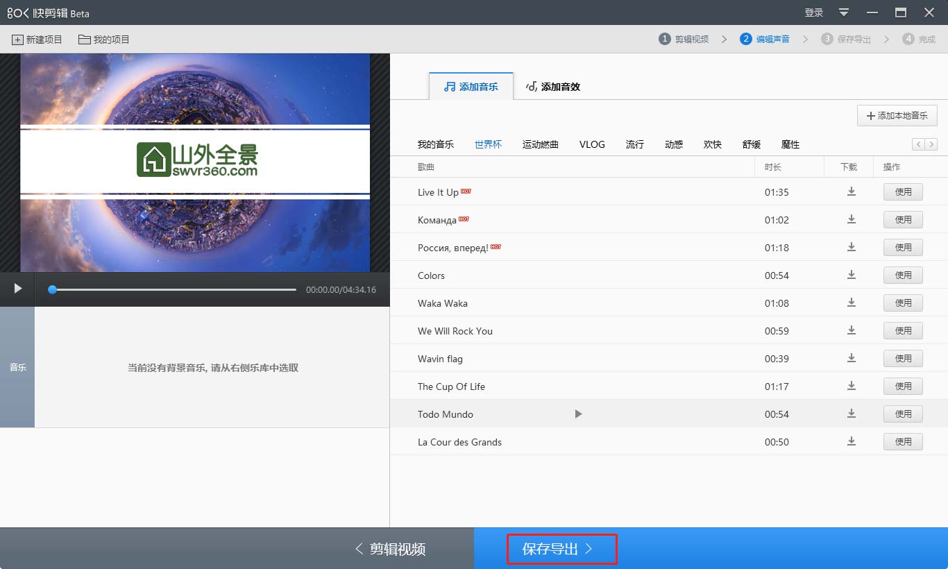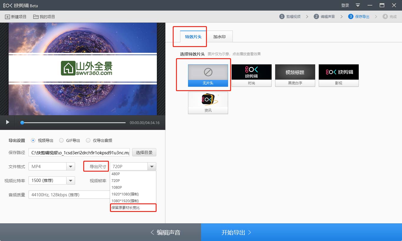 3.若已有音乐,直接点击下面【保存导出】,进入导出页面,如下图所示。左侧设置【文件格式】为MP4,【导出尺寸】为保留原视频长宽比,其他保存不变即可;右侧【特效片头】选择【无片头】