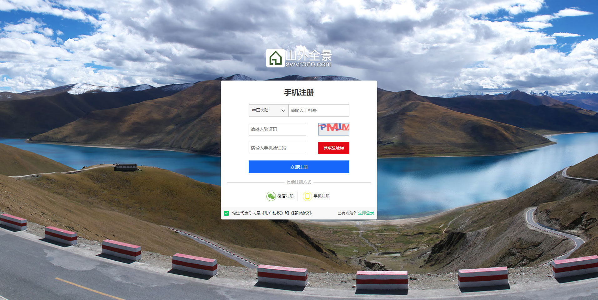 2、如果您之前没有注册过 山外全景云 账号,请您点击右上角注册按钮输入您的手机号验证注册;如果您已经注册过拥有 山外全景云 账号,请点击右上角登陆按钮,输入手机号及密码或使用微信扫码登陆即可。